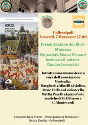 Venerdì 7 marzo alle 17, presso la Sala Eventi, al primo piano dell'ex Monastero Santa Cecilia a Collescipoli, avrà luogo la presentazione del libro "Moresca. Storia sociale di una danza armata" di Ciandrha Lorenzetti. L'iniziativa è a cura del Centro Sociale e Cultura Collescipoli, Ancescao Umbria Sud Aps, Collescipolilibri e Musicalia. Saranno presenti Marco Venanzi insieme all’autrice. L'intrattenimento musicale è a cura dell’Associazione Musicalia, con Margherita Minelli al violino, Irene Ferlito al violoncello e Mattia Pacelli al pianoforte. Verranno suonate musiche di Orlando di Lasso e Claudio Monteverdi.